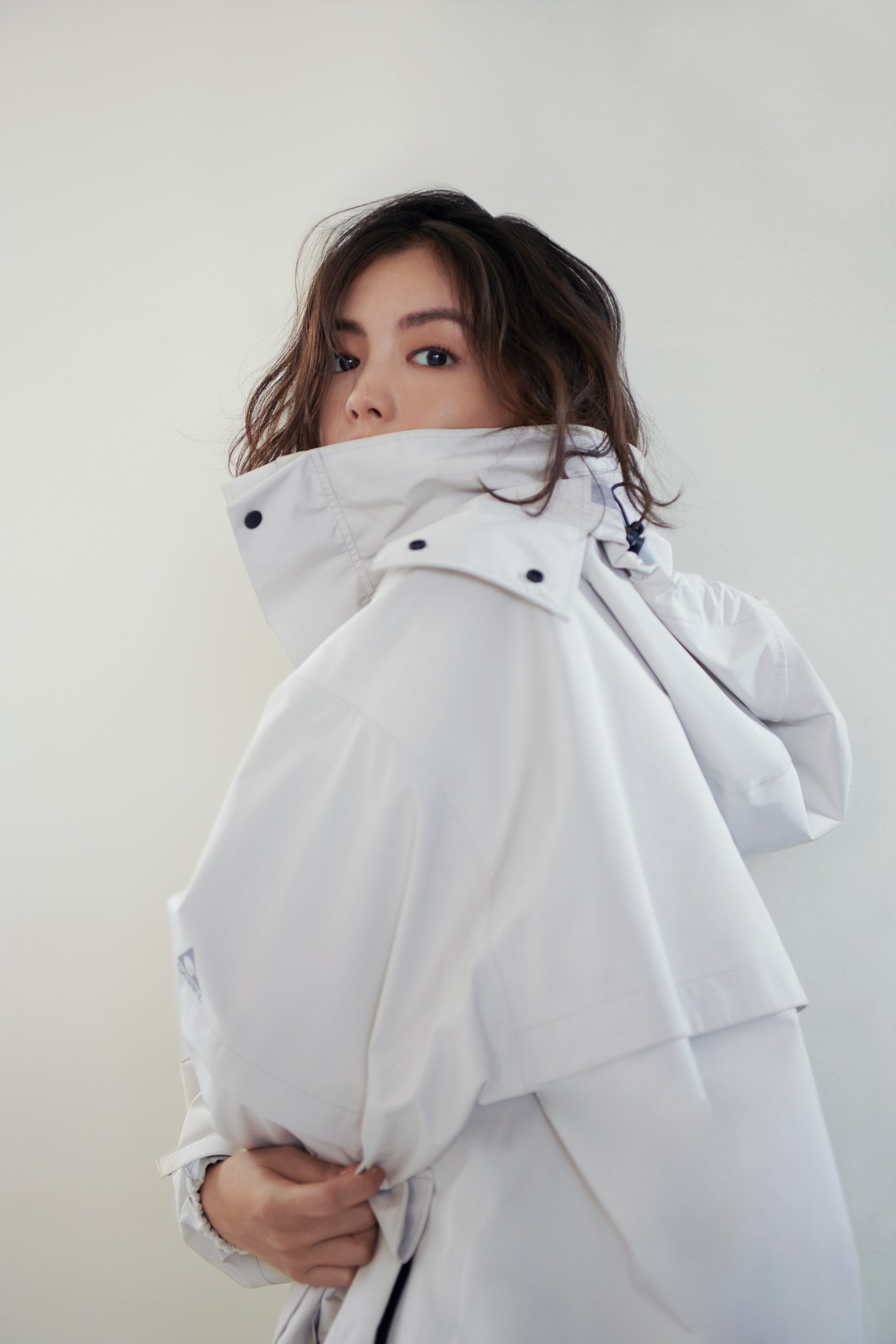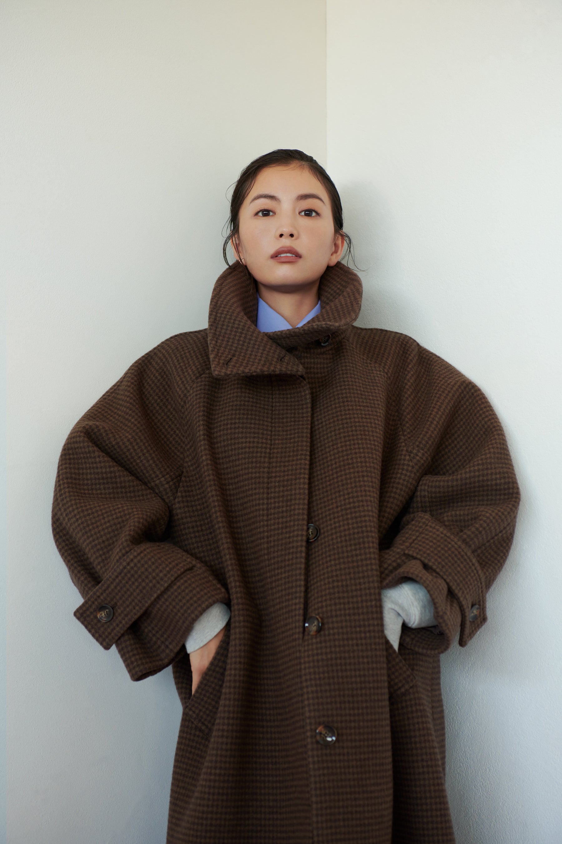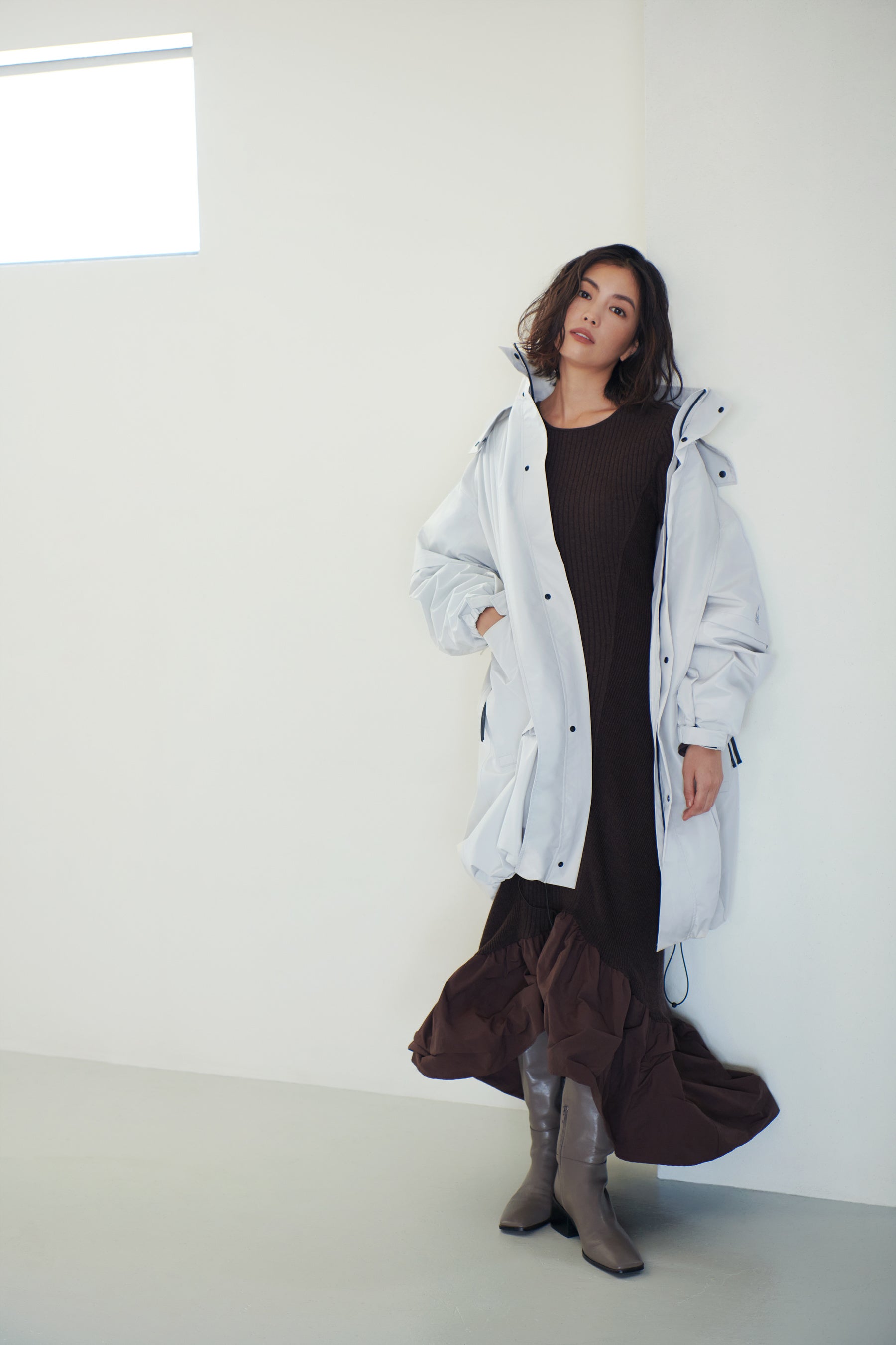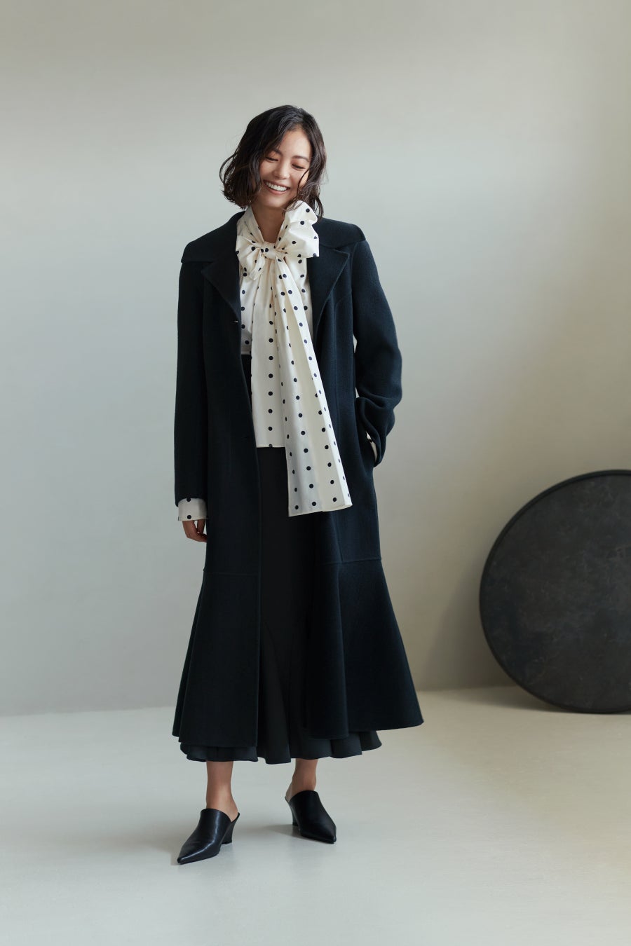 エコファーやパワーショルダー、ペプラムシルエットなどを取り入れたアウター全12型をモデル矢野未希子が着用