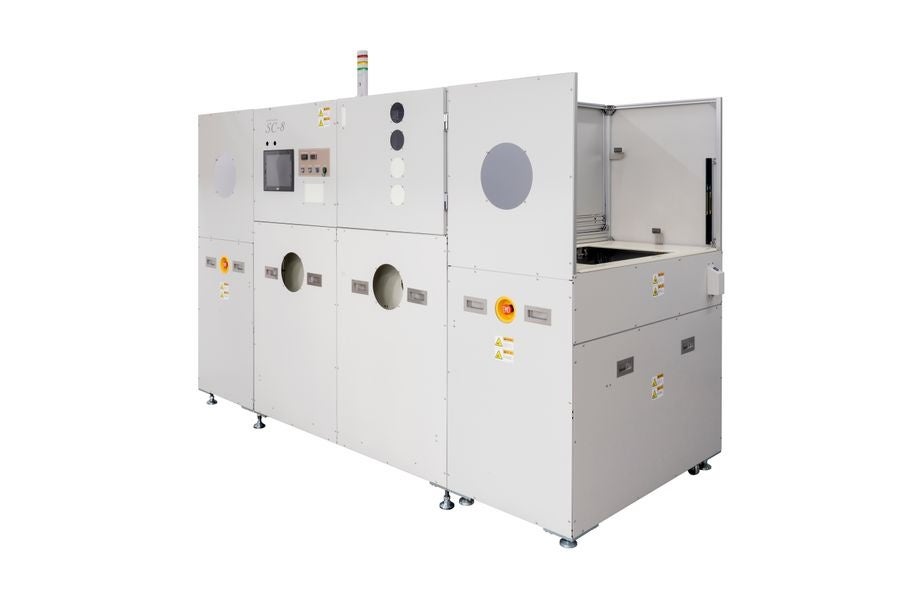 最大8インチウェハキャリア及びBOXまで対応可能な自動洗浄システム。洗浄対象は専用トレイにセットされ、各処理チャンバーで効率の良い洗浄/乾燥が行われます。ワイヤトレイの搬送には、パーティクル防止対策がなされてたヒューグル独自の特殊ローラー方式を採用しています。