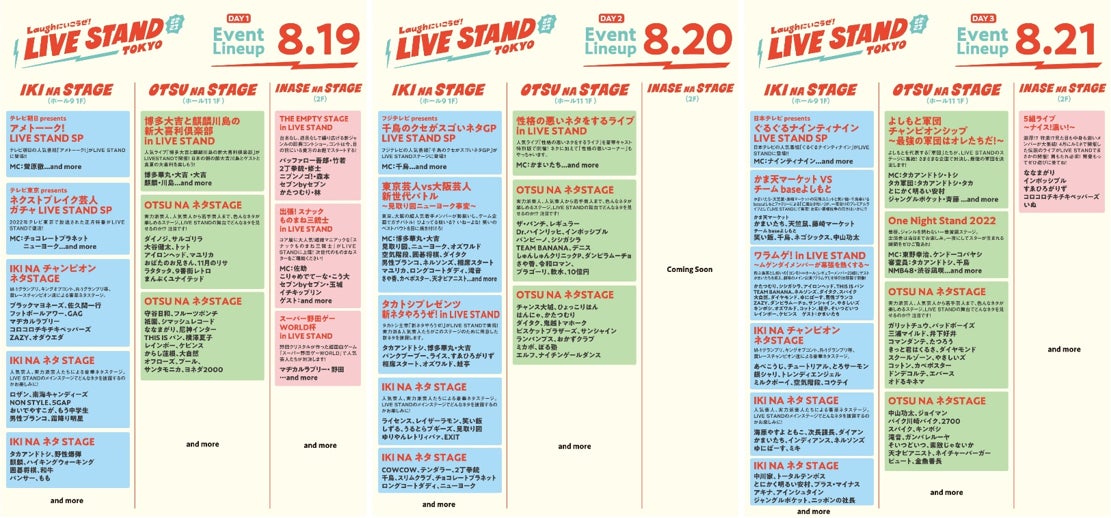 東京公演1日目の8月19日(金)には、テレビ朝日の人気番組「アメトーーク!」、テレビ東京で2022年のお正月に放送された「ネクストブレイク芸人ガチャ」とのコラボステージが決定。「アメトーーク!」とのコラボステージのMCには蛍原徹、「ネクストブレイク芸人ガチャ」のMCにはチョコレートプラネットとニューヨークが決定いたしました。