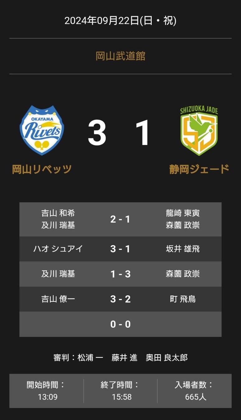 岡山リベッツと静岡ジェードの試合は、3-1で岡山リベッツが勝利しました。