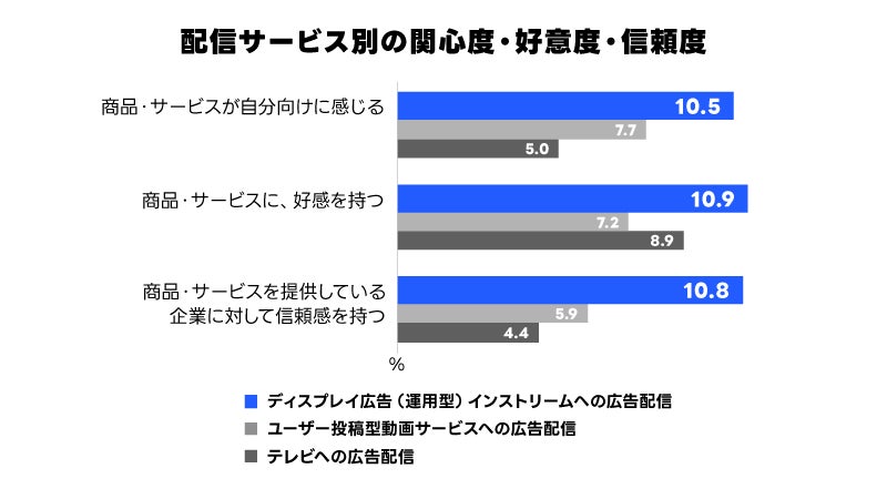 15歳~69歳の男女を対象に実施したWeb調査(※3)では、広告配信サービス別に関心度・好意度・信頼度を比較した結果、「インストリーム広告」が全ての指標で最も高い評価を獲得しています。