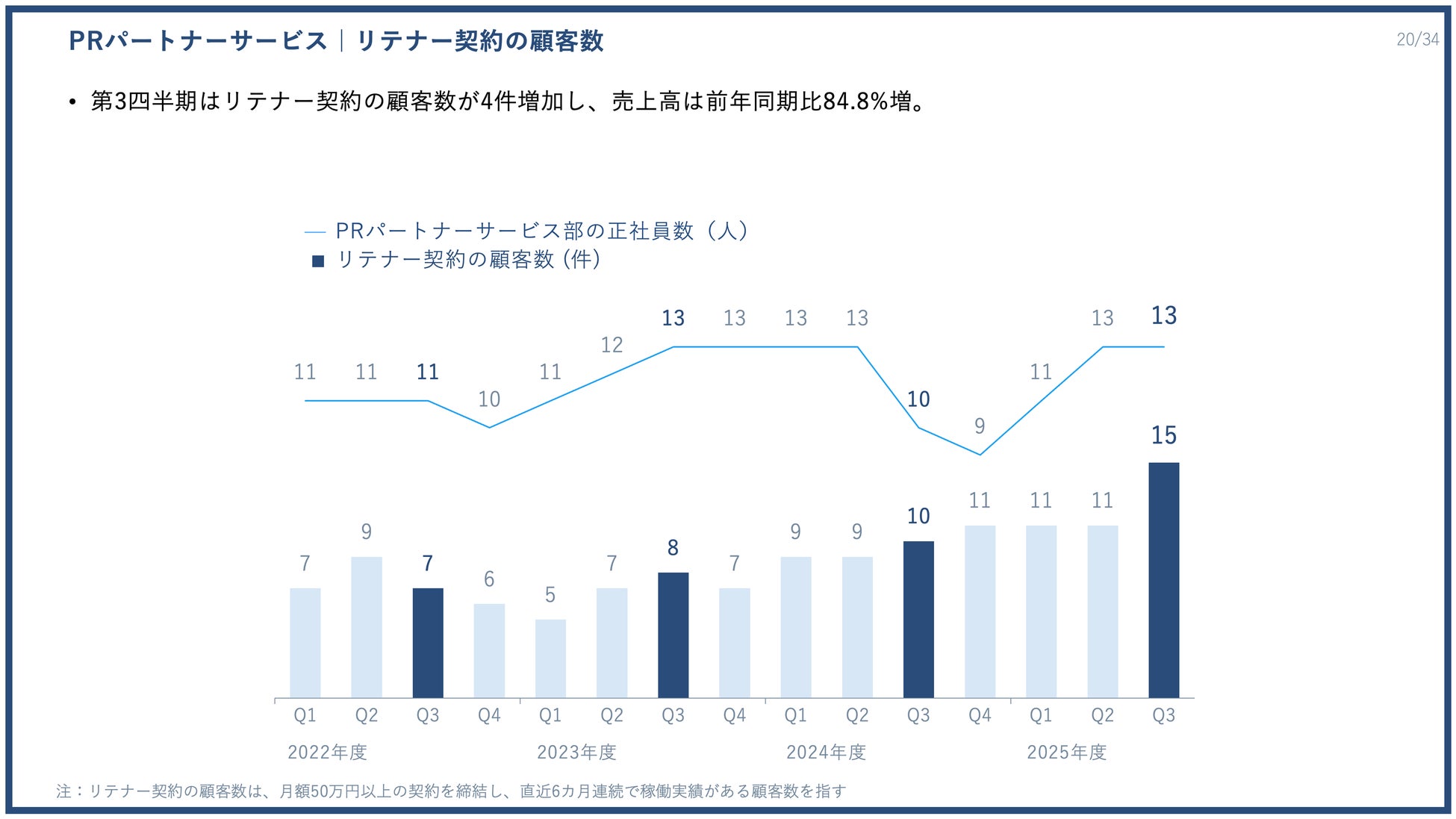 第3四半期はリテナー契約の顧客数が15件と前四半期から4件増加し、売上高は前年同期比84.8%増となりました。正社員数の増減はなく、データとAIを活用したサービス開発、そしてメンバーの能力トレーニングを両輪で進めながら、顧客創造に挑んでいます。