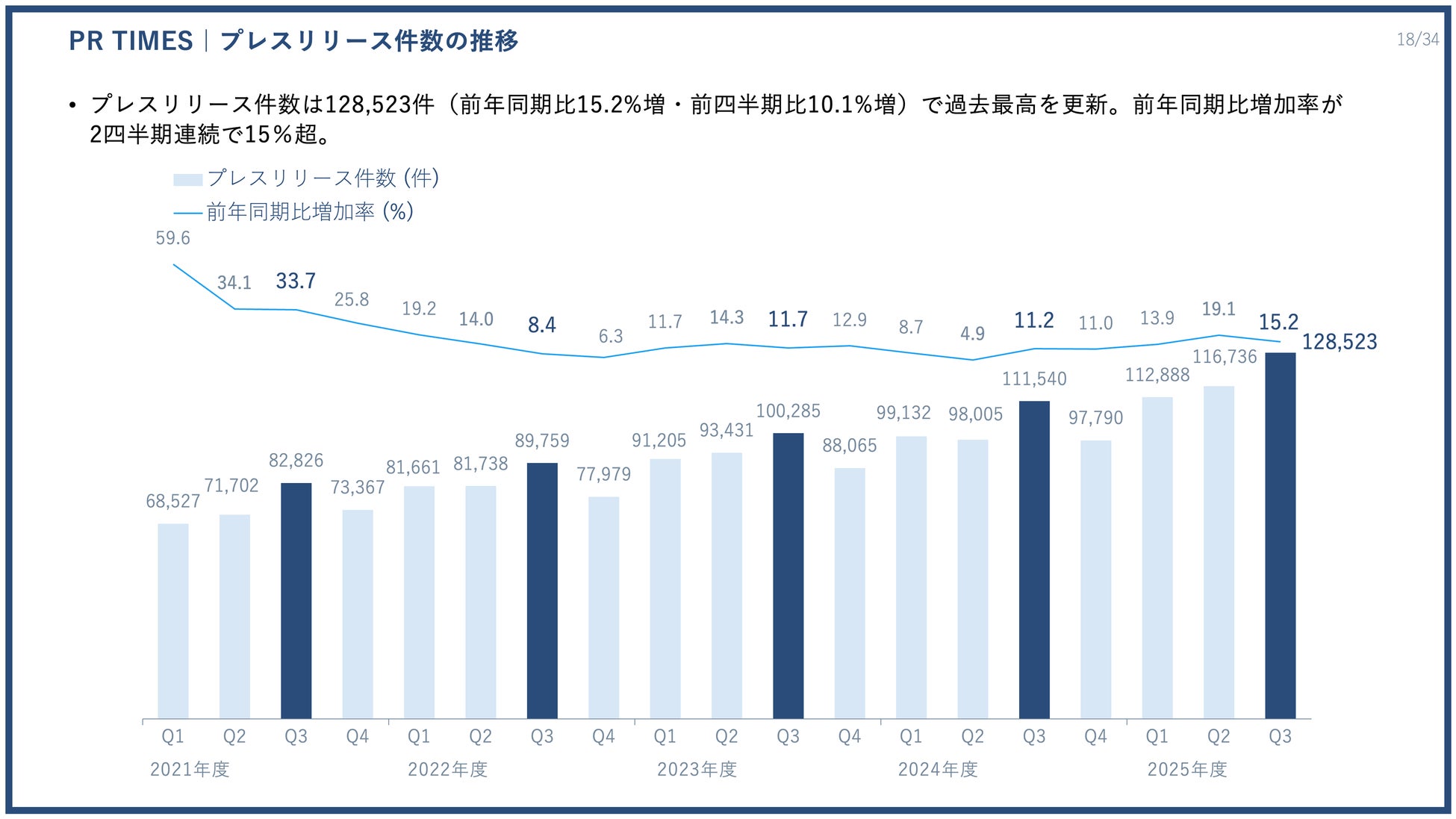 2025年度第3四半期のプレスリリース件数は、12万8523件(前年同期比15.2%増、前四半期比10.1%増)で過去最高を更新しました。成長率としては、前年同期比増加率が2四半期連続で15%を超えています。