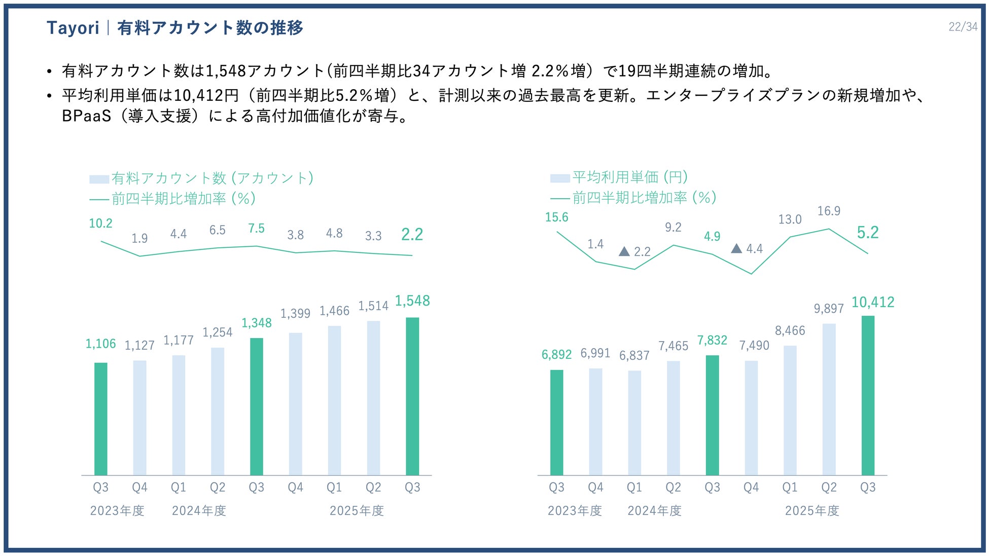 Jootoの有料利用企業社数は2524社(前四半期比1.6%減)、平均利用単価は1万2864円(同1.3%減)。Tayoriの有料アカウント数は1548アカウント(同2.2%増)、平均利用単価は1万412円(同5.2%増)。