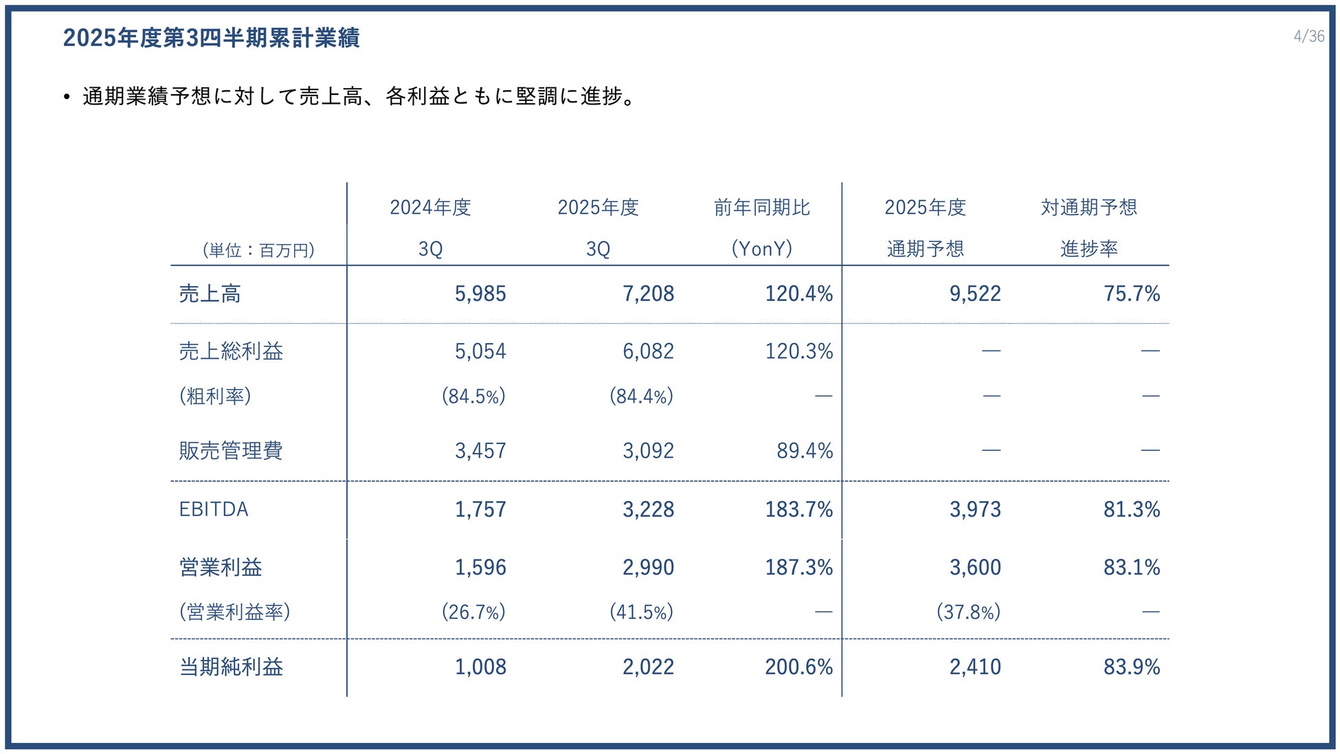 2025年度第3四半期が経過して業績予想に対して、順調に進捗しています。売上高は2025年10月に上方修正した通期予想95億2200万円に対し、進捗率は75.7%(前年同期74.8%)。営業利益は通期予想36億円に対し、進捗率は83.1%(前年同期85.1%)となっています。
