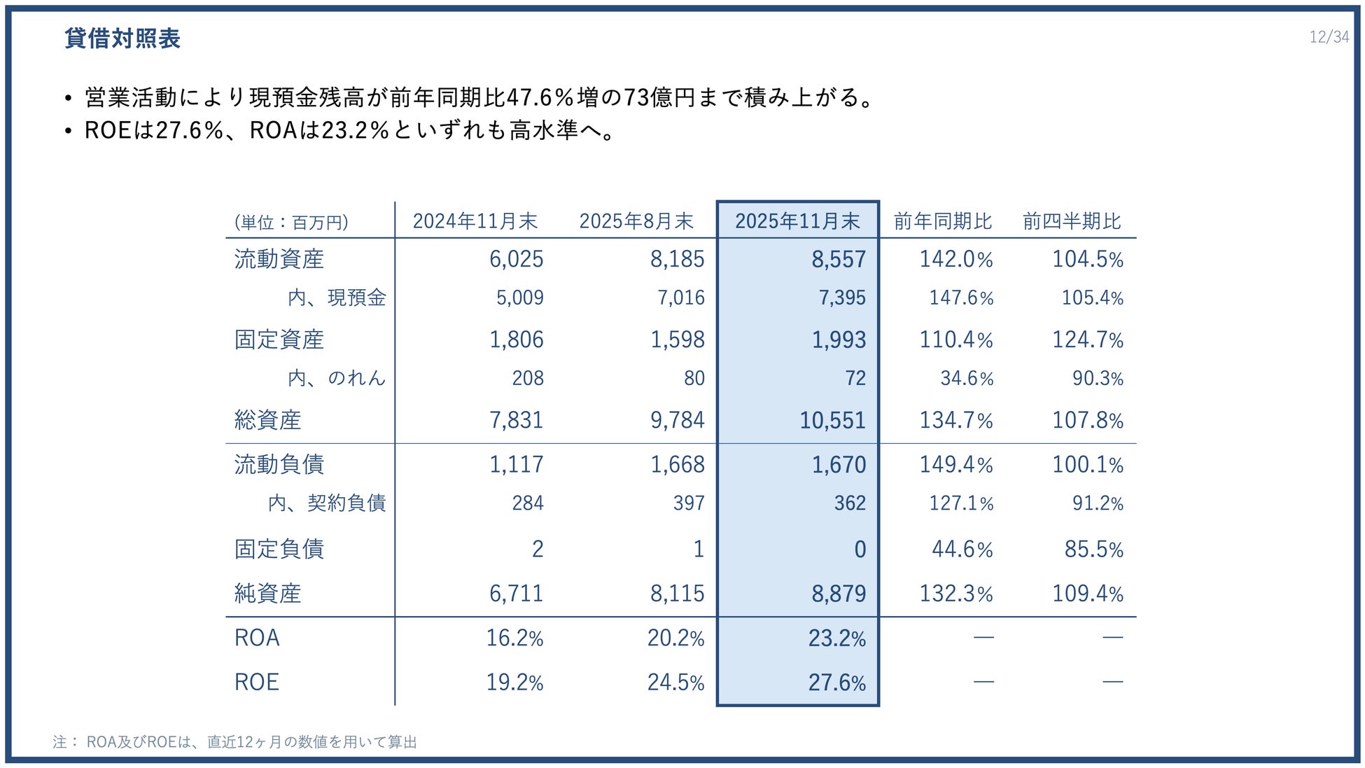 業績概況の最後に、バランスシートを紹介します。営業活動により現預金残高が、前年同期比47.6%増の73億円まで積み上がっています。