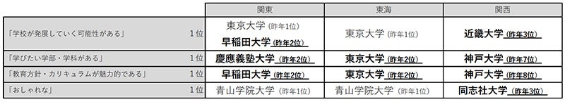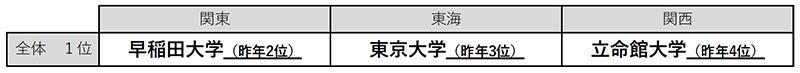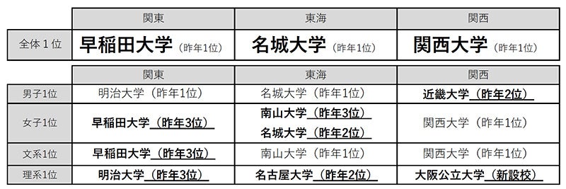 高校生の「志願したい大学」【関東】早稲田大学が2年連続1位 【東海】名城大学が6年連続1位 【関西】関西大学が15年連続1位