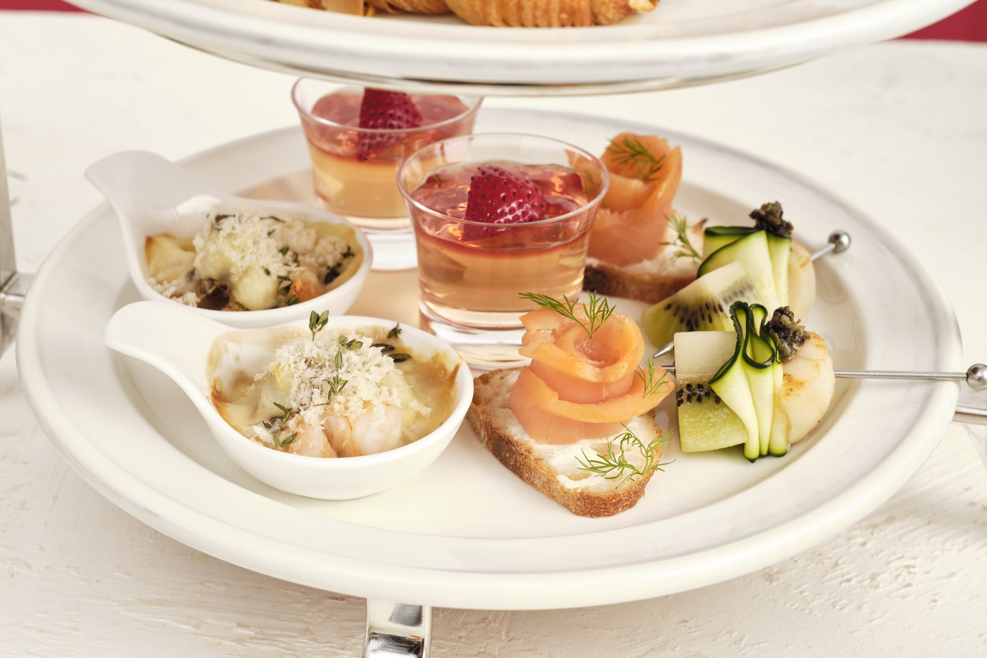 海老とマッシュルームのグラチネ、スモークサーモンのブーケタルティーヌ、ホタテとズッキーニのピンチョス、苺のスパークリングゼリー