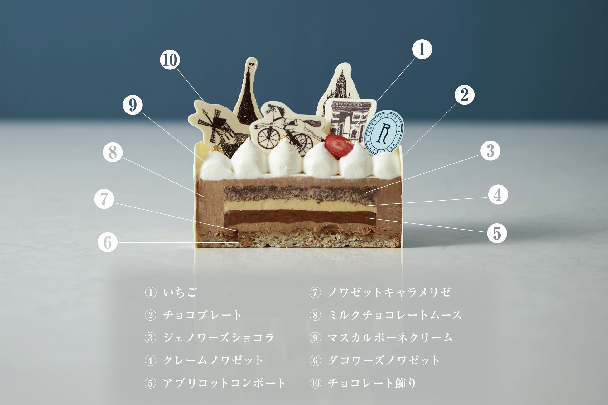きらびやかな聖夜のパリをイメージしたRITUELのクリスマスケーキ「Noël a Paris 2023(ノエル ア パリ2023) 」。キャラメリゼしたヘーゼルナッツを散りばめたダコワーズを土台に、自家製ヘーゼルナッツプラリネのクレームブリュレと甘酸っぱいアプリコットコンポートをセンターに忍ばせ、滑らかなチョコレートムースで包みました。