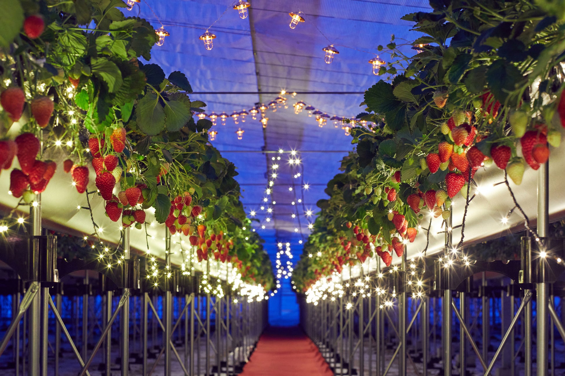 夕食後、客室に用意されたナイトストロベリーツアーの招待状を手にホテルを出発し、向かう先はイルミネーションが輝くハウスです。ハウスの中に入ると、レッドカーペットが敷かれたいちごのレーンが目の前に広がり、まるで特別なパーティーに招かれたような気分に。日常を忘れさせる幻想的な貸し切りの空間で、心ゆくまでいちご狩りを楽しめます。