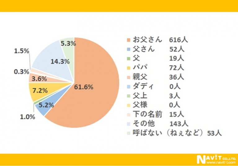 父親を呼ぶ時に最も多いのは「お父さん」で616人。他はぐんと減って、「パパ」72人、「父さん」52人、「親父」36人などでした。