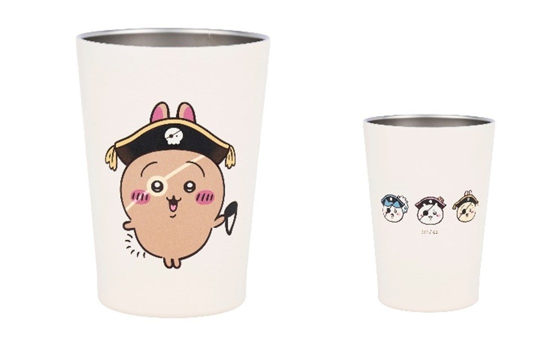 海賊になったちいかわ、ハチワレ、うさぎがプリントされた保冷・保温タンブラー。表面は日焼けうさぎデザインです。