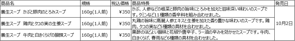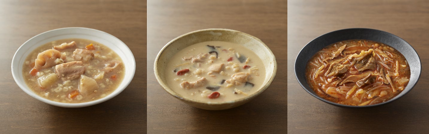 養生スープは季節感のある食材に食養生につながる素材を組み合わせることで、食を通じた養生の一助となることを目指して開発したスープです。手軽に食養生を生活に取り入れ、おいしく食べていただけるようにパッケージのまま電子レンジで温めて食べられる仕様にしており、味も工夫しています。スープのベースは、クミン、花椒などの香辛料と、高麗人参エキスを組み合わせて作っており、香りや辛み、滋味深い味わいを楽しんでいただけます。さらに具材には秋冬に旬を迎える根菜や生姜、きのこなどの野菜と肉や雑穀を豊富に入れ満足感の高い仕上がりになっています。今回豚肉、鶏肉、牛肉をメインに据えた3種類のラインナップを用意しました。