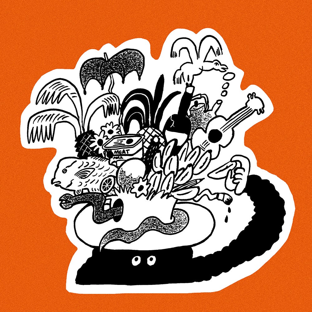島・椰子の木・ソテツ・アダン・島たこ・エラブチ・サーファー・水着のお姉さん・高倉・島バナナ・マンゴー・芭蕉の葉・お酒の瓶・三味線・ケンムン(奄美に伝わるけむくじゃらの精霊)