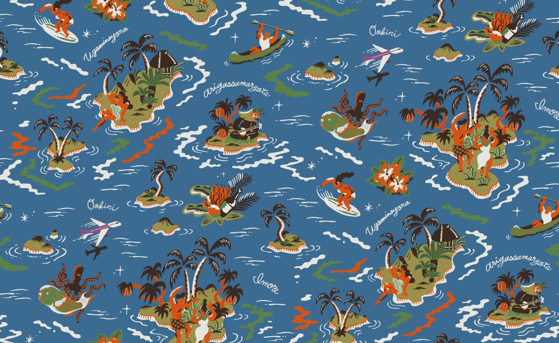 イメージはアンティークのアロハシャツ。海に住まう生き物、サーフィンやカヌーなどアクティビティを楽しむ人々、島の伝統芸能である三味線を嗜む人など、奄美大島にまつわるモチーフの中に、Peachの飛行機、そして奄美の島言葉をメッセージとして散りばめています。見ているだけで心躍るようなオリジナルのイラストが完成しました。