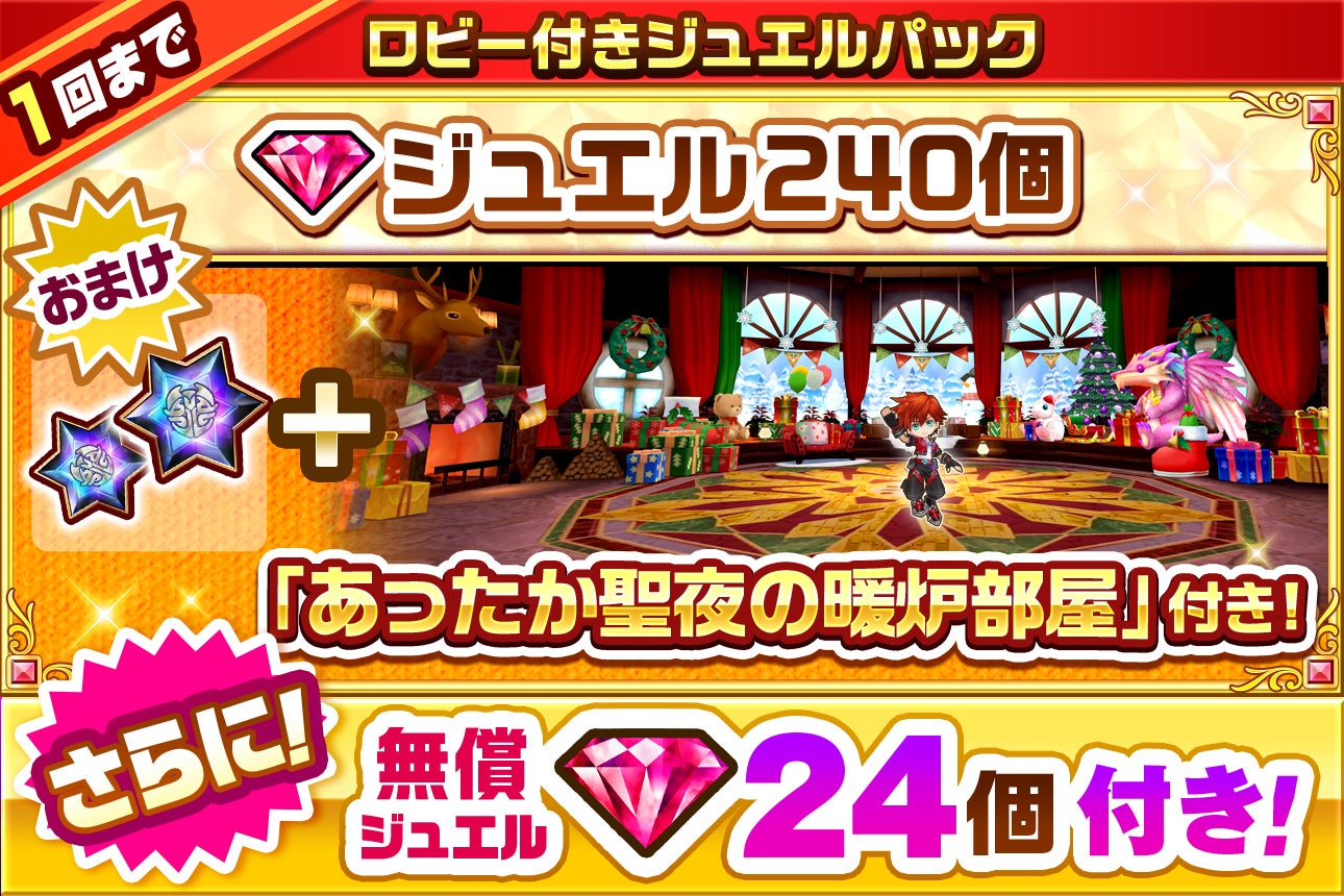内容物:「ジュエル」240個、「無償ジュエル」24個、ロビー「あったか聖夜の暖炉部屋」