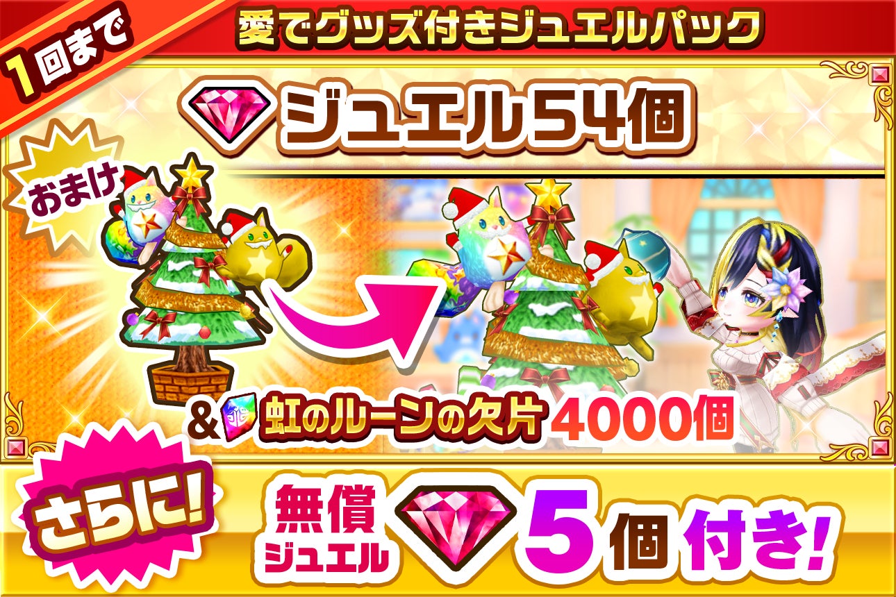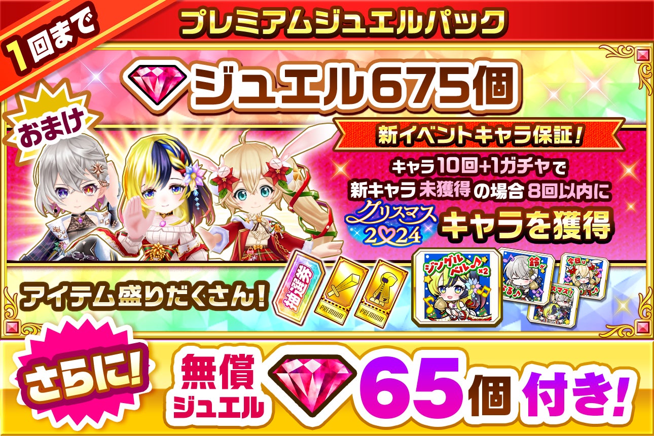 また、同時期に販売するプレミアムジュエルパックには「デネブ」「エレノア」「ツキミ」がクリスマスソングを歌いあう「歌うスタンプ」が付くほか、協力バトルのロビーを今回のストーリーに登場する「あったか聖夜の暖炉部屋」に変更することができる、ロビー付きジュエルパックを販売しております。