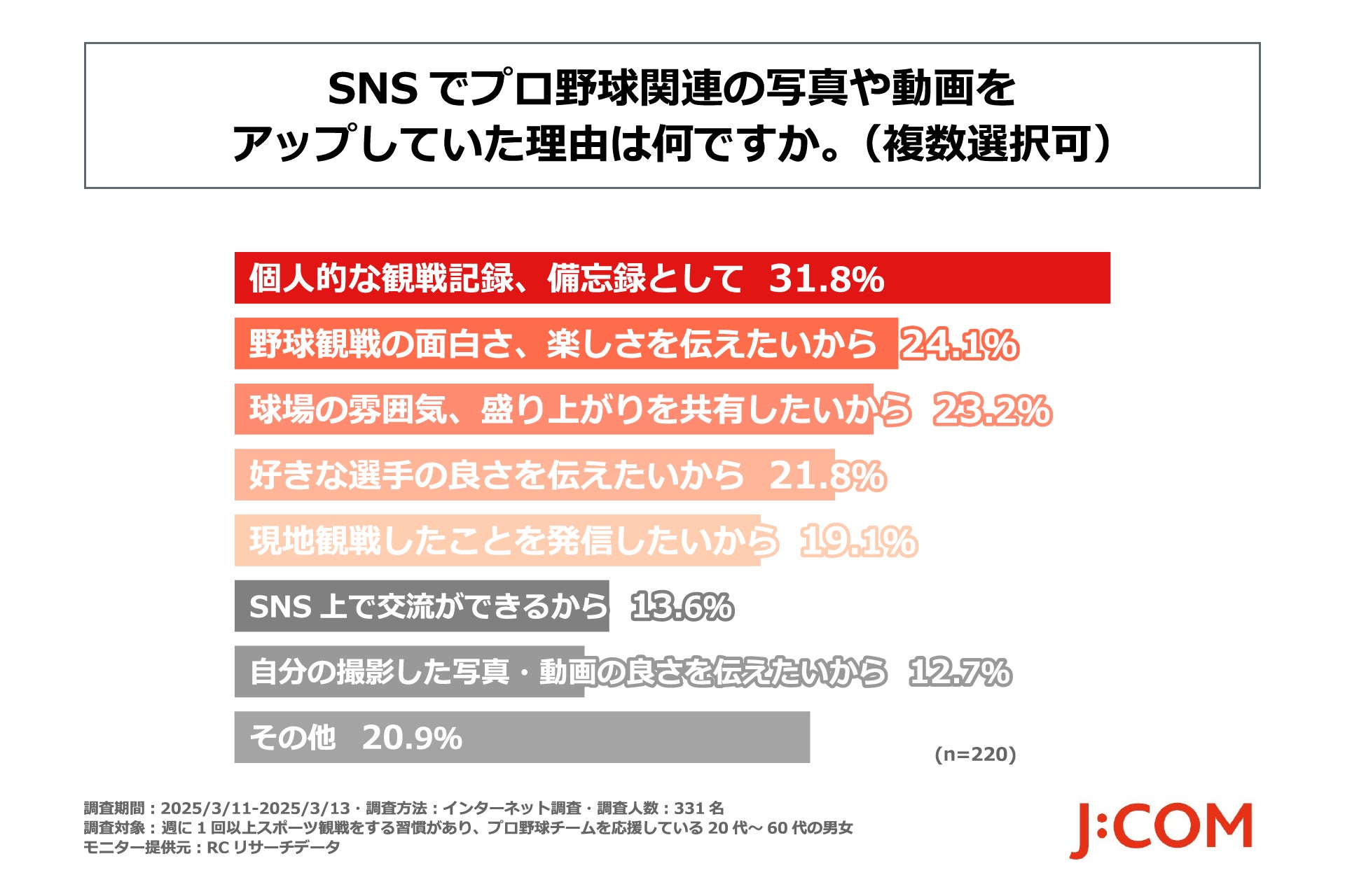 プロ野球観戦時、写真・動画のSNS投稿を見ていた、もしくはSNSにアップしていたと回答された方に「SNSでプロ野球関連の写真や動画をアップしていた理由」を尋ねる設問への回答で多かったのは、1位が「個人的な観戦記録、備忘録として」で31.8%、2位が「野球観戦の面白さ、楽しさを伝えたいから」で24.1%、3位が「球場の雰囲気、盛り上がりを共有したいから」で23.2%という結果になりました。