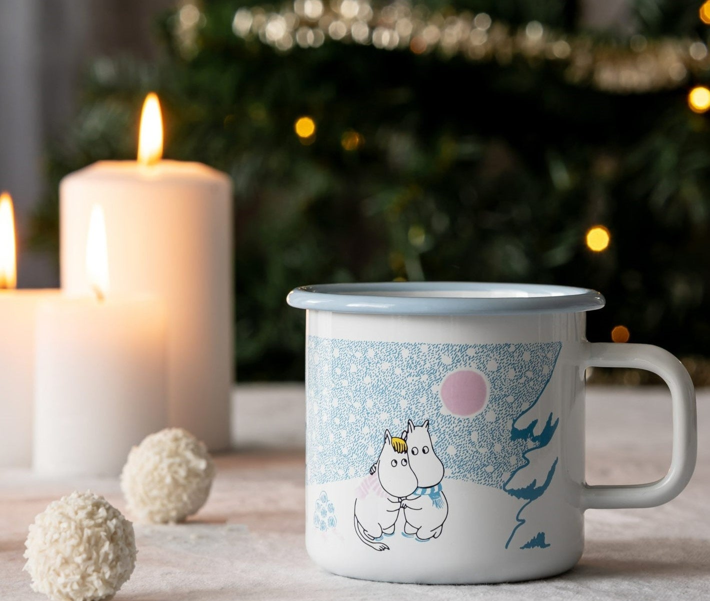 ムーミンカウッパ限定柄のマグカップです。雪が舞う中でムーミントロールとスノークのおじょうさんが寄り添うロマンチックな新シリーズ。