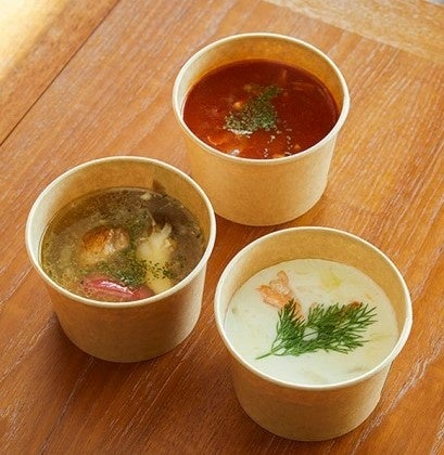 奥から時計回りに)選べる3種のスープは、トマトスープに牛肉などを入れた“リハケイット”、「KeittoRuokaa」風にアレンジした北欧で定番のサーモンスープ、ブイヨンベースのきのこスープ。会場ではスープだけの販売も。