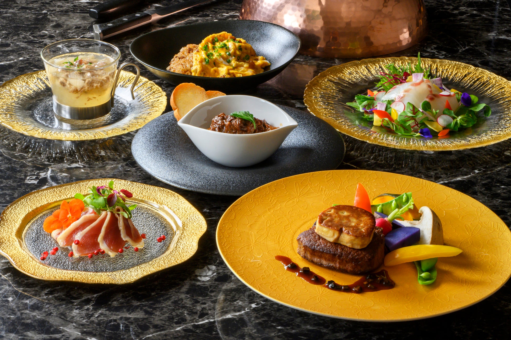レストラン「アゼリア」では、ローストビーフやラムのブロシェット、低温調理したポークなど多彩なメニューを取り揃えたブッフェを、中国料理「四川」では北京ダックや国産牛のブラックペッパーソースなど全6品をご賞味いただけるコースを、鉄板焼「貴布祢」では、メインに黒毛和牛フィレをロッシーニ風に楽しめる贅沢なコースをご用意します。