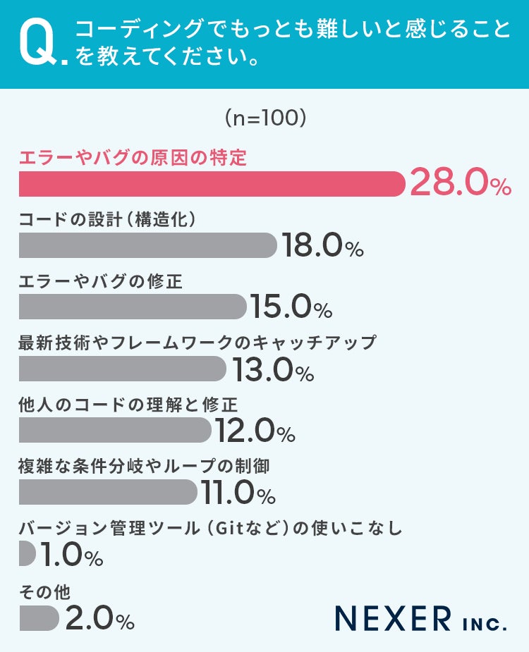 コーディング経験者の28%が、もっとも難しいと感じることは「エラーやバグの原因の特定」だと回答しています。