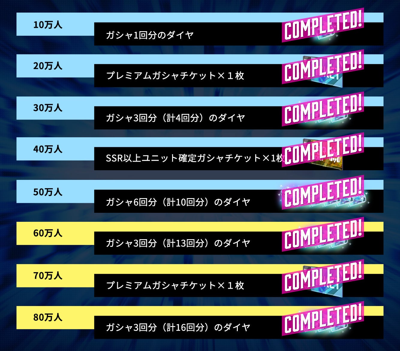 400,000人突破⇒SSR以上ユニット確定ガシャチケット×1枚 達成済