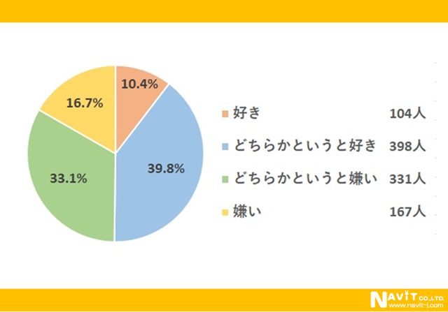 ハロウィンのイベントの好き嫌いについて、「好き」104人、「どちらかというと好き」398人。「嫌い」167人、「どちらかというと嫌い」331人。好きと嫌いの比率はほぼ半々でした。