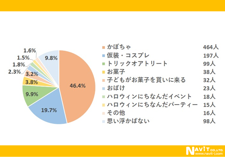 ハロウィンで1番に思い浮かべるものは「かぼちゃ」が飛びぬけて多く464人。次いで「仮装・コスプレ」197人、「トリックオアトリート」99人などと回答しています。