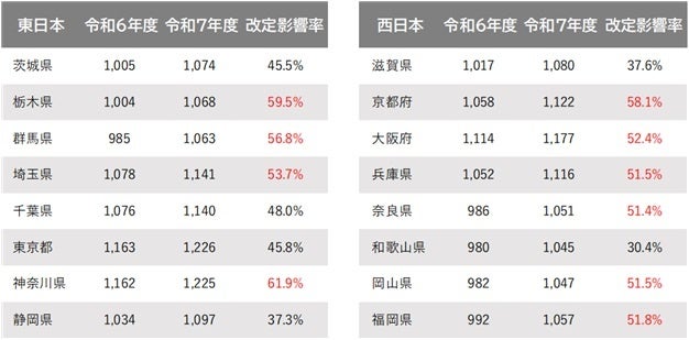 今年度の改定でいずれの地域でも地域別最低賃金は1000円を上回り、改定影響率が低い結果となった地域であっても、その数値は3割を下回ることはなかった。