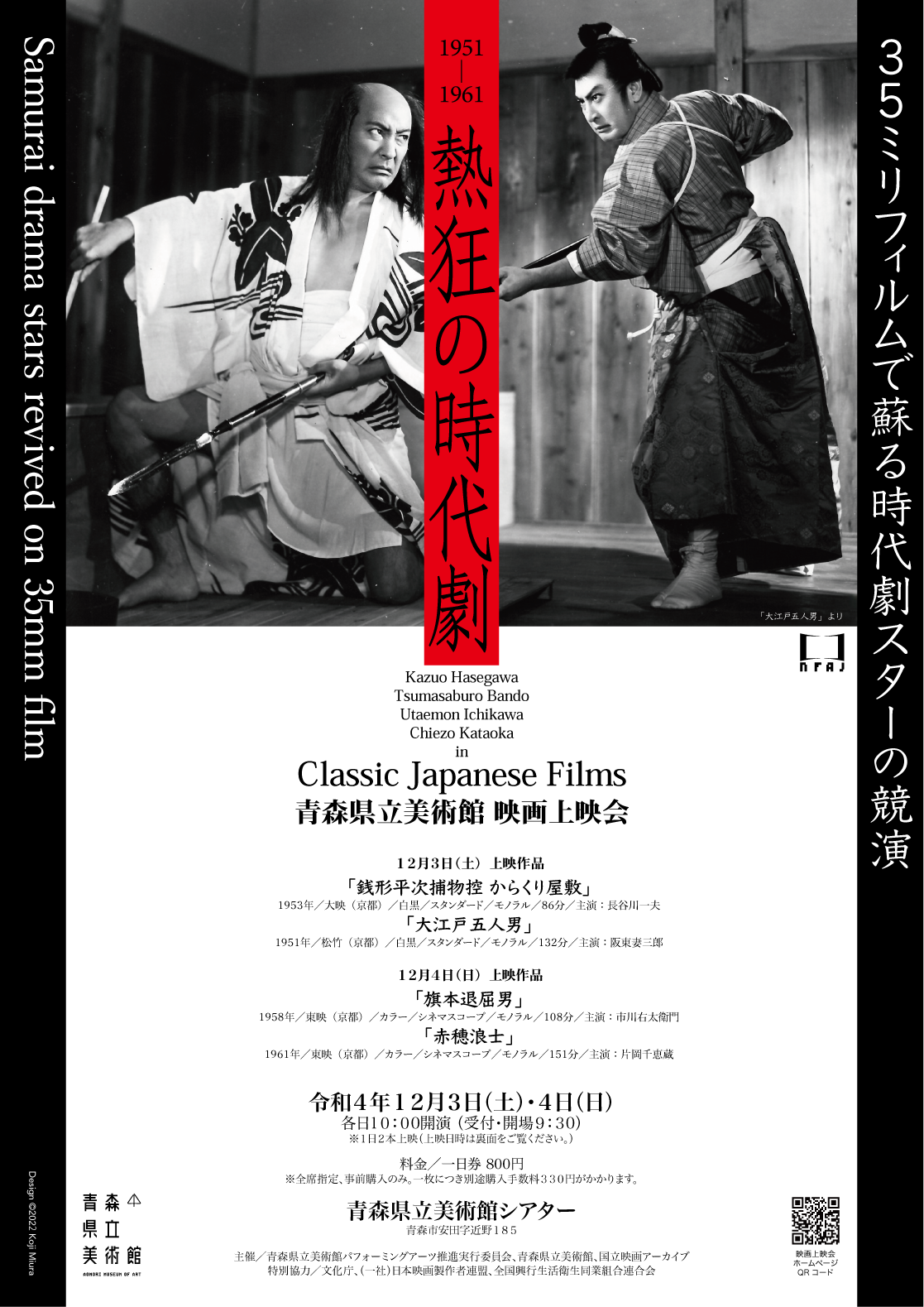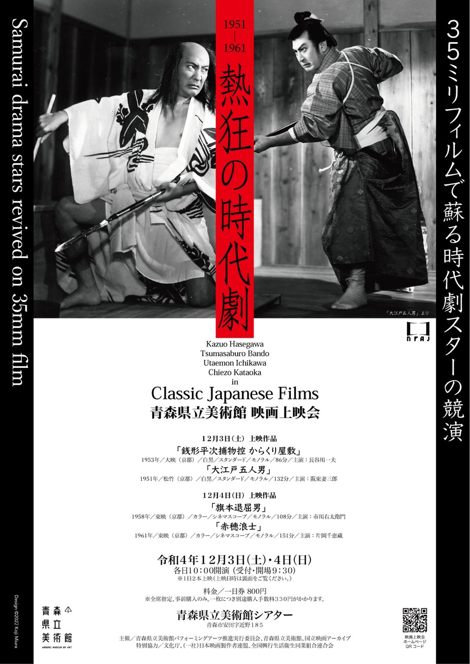 青森県立美術館パフォーミングアーツ推進実行委員会、青森県立美術館、国立映画アーカイブ主催、県立美術館映画上映会『熱狂の時代劇~35ミリフィルムで蘇る時代劇スターの競演~』が2022年12月3日(土)~12月4日(日)に青森県立美術館シアター(青森県青森市安田字近野185)にて開催されます。
