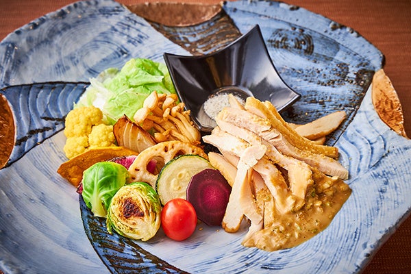 また、柔らかな歯ごたえとジューシーさ、そして奥深い旨みが特徴の「長崎対馬地どり」は胸肉を蒸して細切りにし、同じく細切りにしてごま油で和えた長崎県産のさつま揚げと一緒に、粗く刻んだねぎが入った旬香特製の胡麻ソースをかけました。鶏肉とさつま揚げどちらの味も引き立てる特製ソースは、付け合わせの旬の野菜やきのこに合わせて召し上がっていただくのもおすすめです。