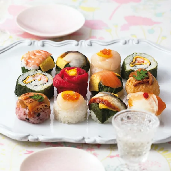 蟹わさび巻・花びらあんぽ寿し・紅華手鞠・手鞠帆立のいくら添え・うに尽くし×各2 手鞠わさび葉寿し(鮭・鯖・海老・鰻)・古代あなら寿し×各1