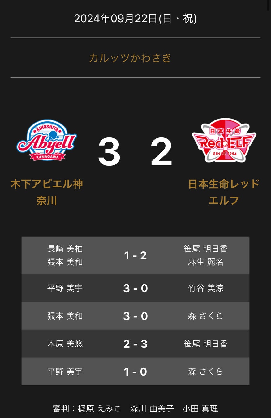 ノジマTリーグ 2024-2025シーズン 公式戦 9月22日開催 木下アビエル神奈川 vs 日本生命レッドエルフの試合は、3-2で木下アビエル神奈川が勝利しました。