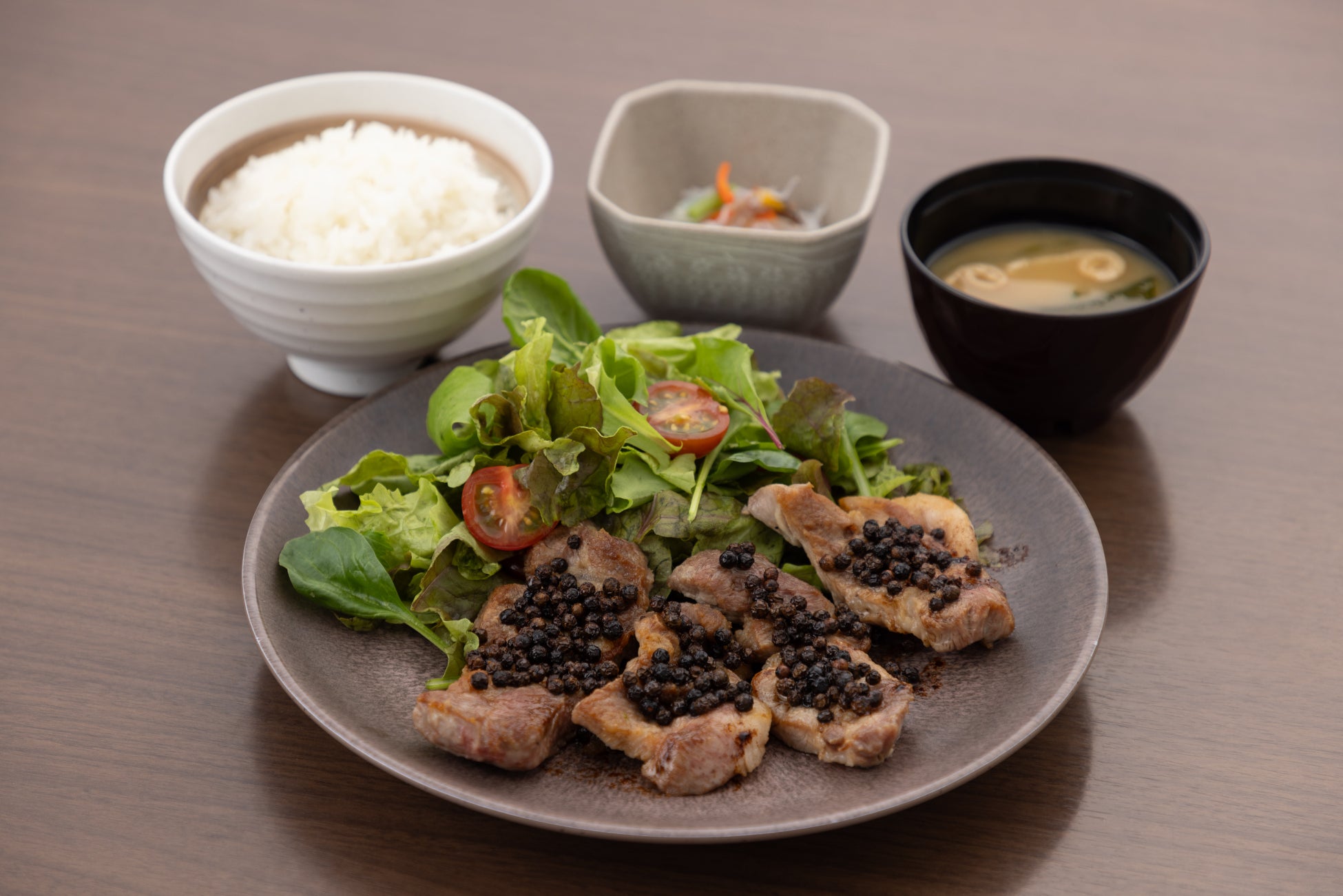 大粒の黒コショウの辛味がピリリときいたインパクトのステーキ。サウナ後のパワーチャージにぴったりのメニューです。