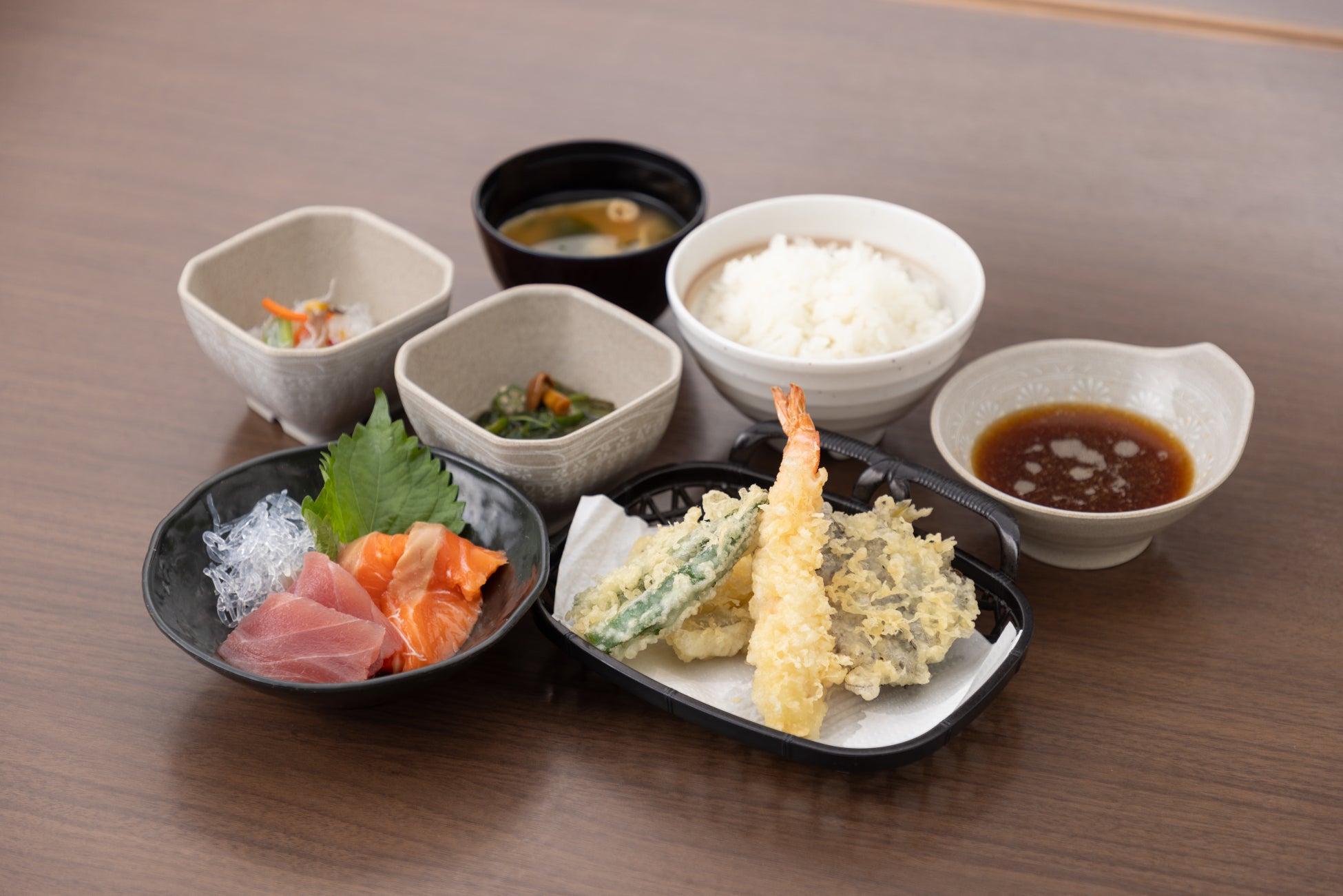 自慢の天ぷらと刺身をメインに、2種類の小鉢が嬉しい御膳です。十八穀米に変更可能です。
