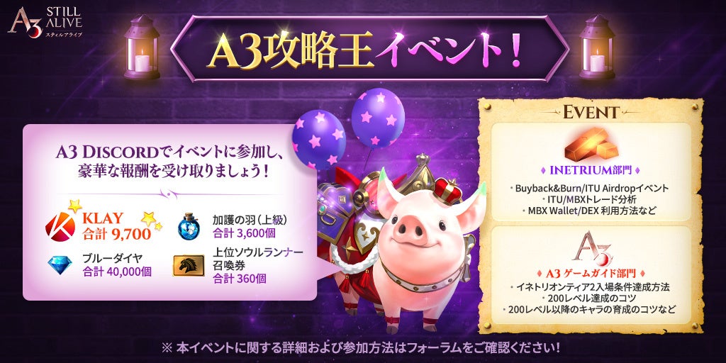 巨額の報酬を獲得できるチャンスがある「A3攻略王イベント」は、プレイヤーが作成したプレイに役立つガイドを他のプレイヤーにシェアするイベントです。募集するガイドのテーマは、「INETRIUM部門」と「A3ゲームコンテンツ」があり、作成したガイドをご自身のSNSにハッシュタグ「#A3 #INETRIUM」を付けて投稿し、『A3: Still Alive スティルアライブ』公式Discordの「A3 Tip King Event」チャンネルに、作成したガイドのURLを投稿することで本イベントに参加できます。Discordチャンネルにて役に立つガイドの投票が行われ、順位に応じてKLAYなどの報酬を獲得することができます。