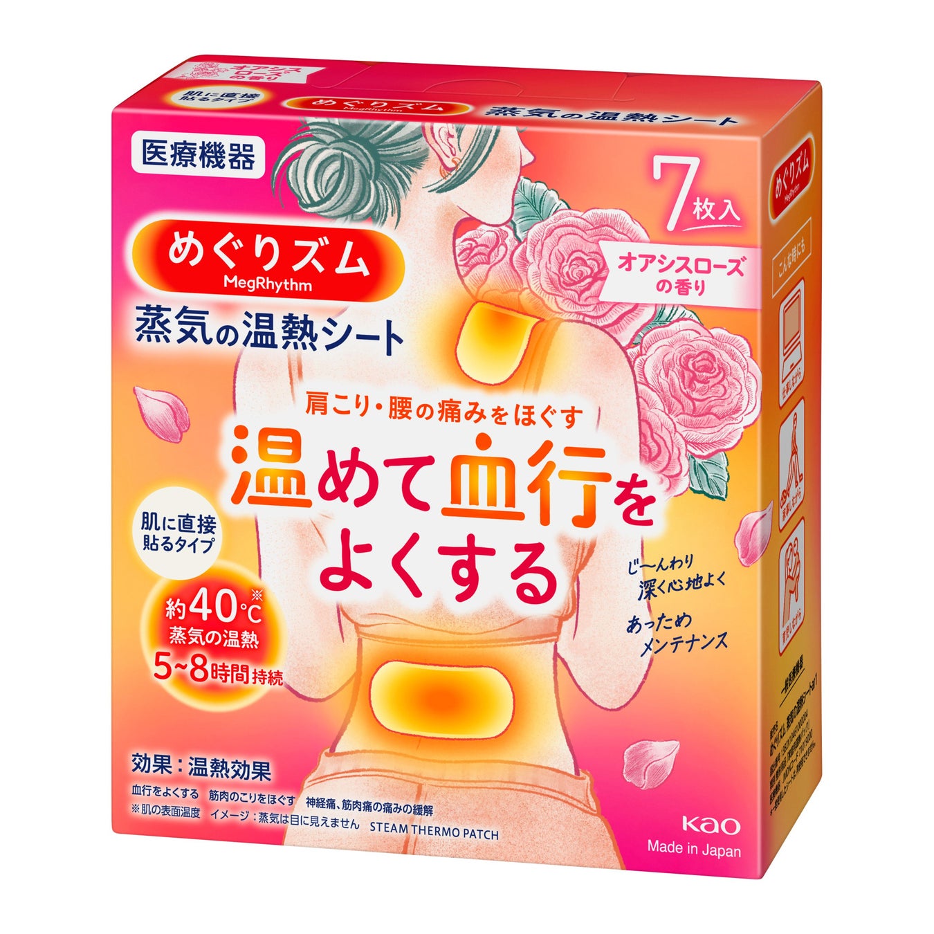来年で発売20周年を迎える「めぐりズム 蒸気の温熱シート」(一般医療機器)より、初の香り付き商品をご用意しました。天然らしさのあるオアシスローズの香りを感じながら、肌あたりのやさしい蒸気の温熱が、患部をじ~んわり温めて血行促進。痛みやこりのもとを流しやすくし、症状を緩和します。