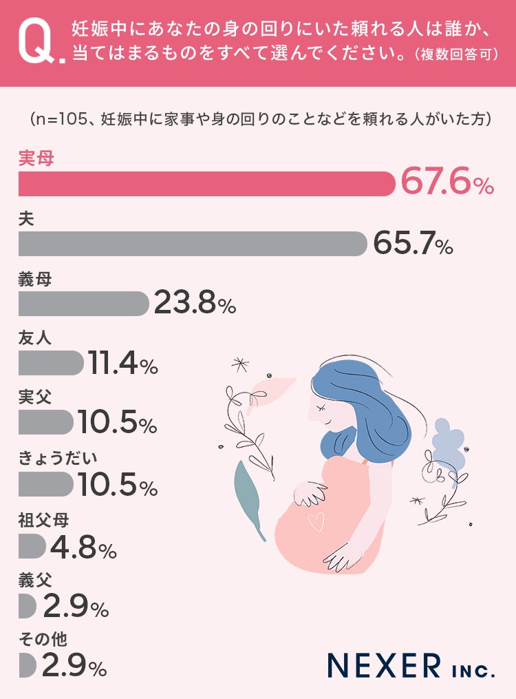 ■67.6%が、妊娠中に頼れた人は「実母」と回答し「夫」よりも多い結果に