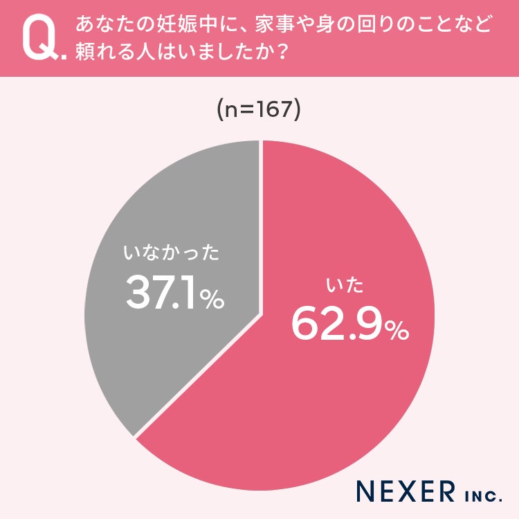 37.1%の方が、妊娠中に家事や身の回りのことなど頼れる人が「いなかった」と回答しています。