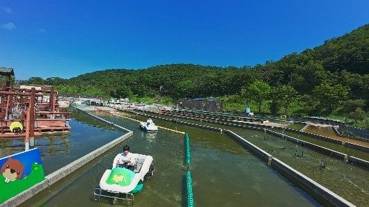 「スプラッシュビーグル」は、陸上も水上も走ることのできる水陸両用自転車。コース途中には水しぶきやミスト、バブルや滝などの仕掛けが盛り沢山です。
