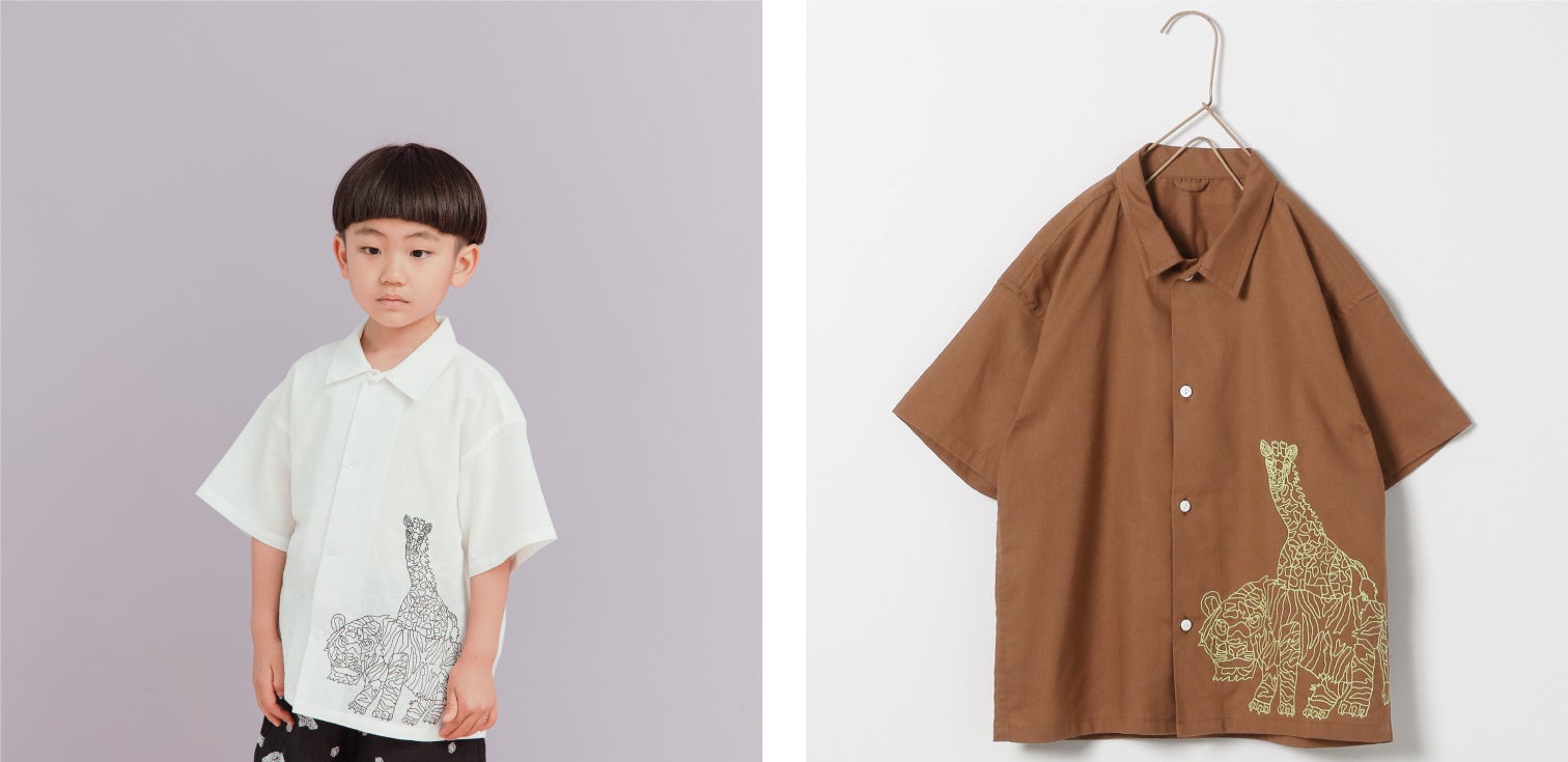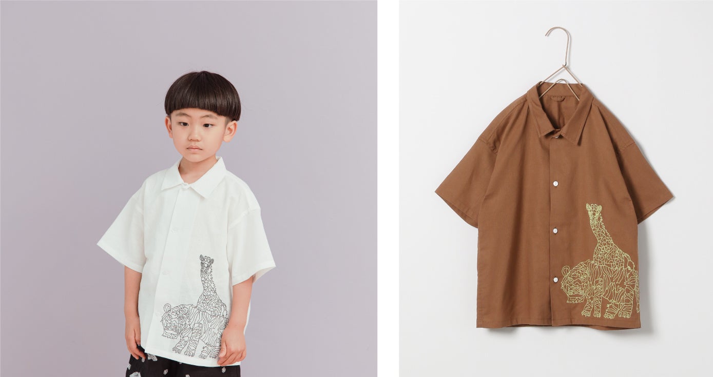 トラとキリンが大きく刺繍されたボックス型のシャツ。