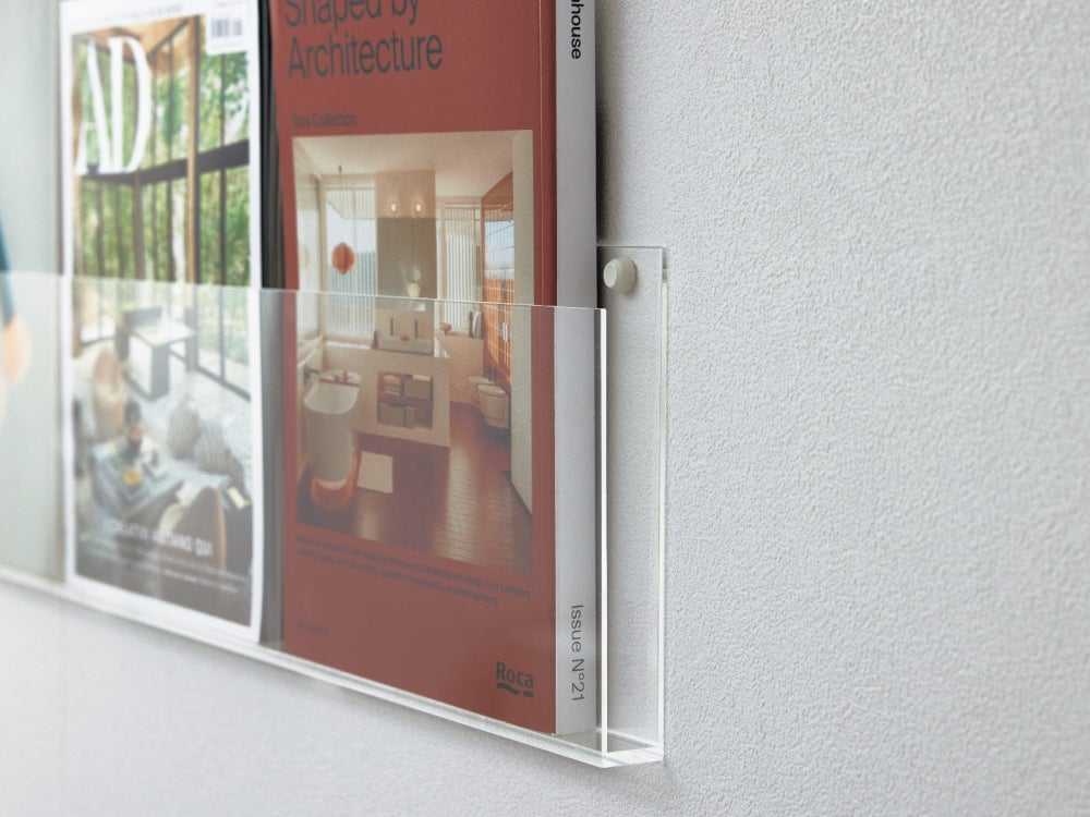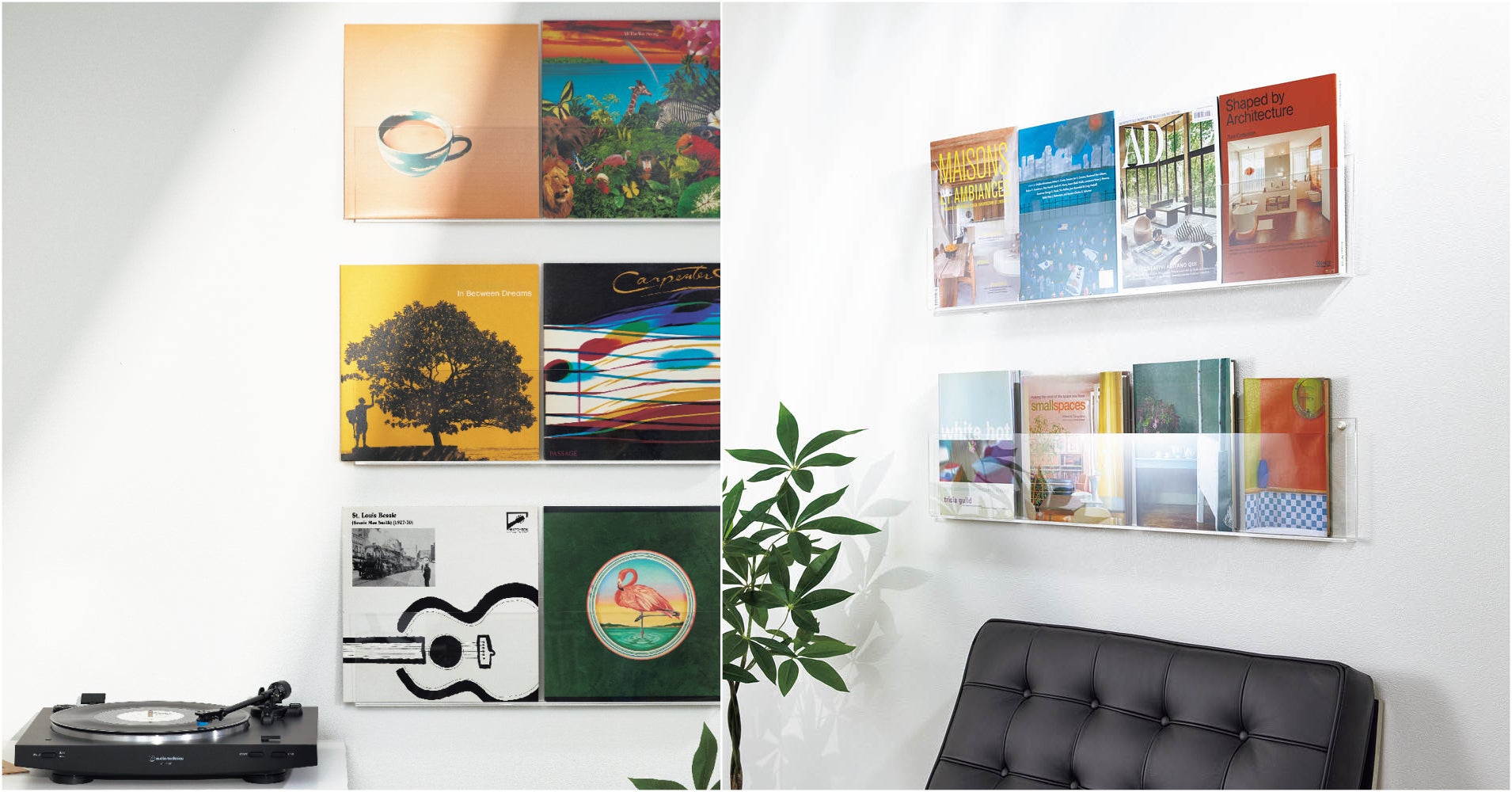 ポスターを壁に貼る感覚で、レコードジャケットや写真集、雑誌、絵本、フォトパネルなどを置くだけで飾れるラックです。透明のアクリル製なので圧迫感がなく、まるで宙に浮いているかのようなおしゃれなディスプレイが楽しめます。