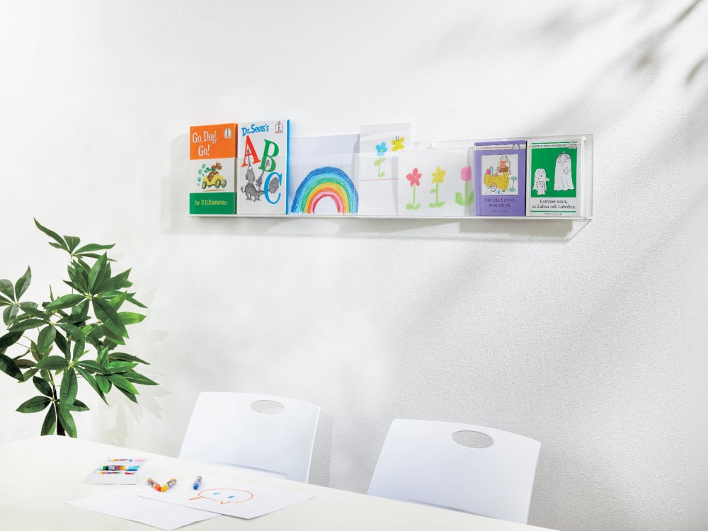 推し活グッズの収納にもおすすめ。推しのCDや写真集、フォトパネル、うちわ、ポストカードなどを並べるだけで、グッズがインテリアになります。置くだけで飾れるので入れ替えもスムーズです。定期的にテーマを変えて並べ直すことも楽しめます。子どものお絵かきも、イラストが可愛い絵本といっしょに飾れば素敵なアートになります。作品にテープやピンの跡をつけなくても済むのがうれしいポイントです。広い空間では横に並べて使うのもおすすめです。