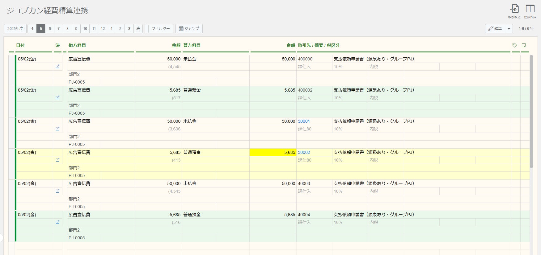 今回のAPI連携により、『ジョブカン経費精算』から「経費精算後の仕訳」「請求書の支払仕訳」が、『ジョブカン会計』の連携画面に自動で入力されます。