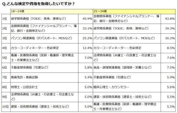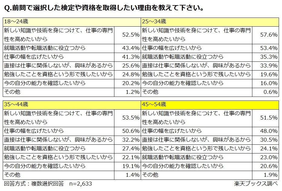 ●資格を取得したい理由は「新しい知識や技術を身に付けて、仕事の専門性を高めたいから」が全年齢層で5割以上と最多。年齢別では、18~24歳は「就職活動や転職活動に役立つから」(43.4%)、25歳以上は「仕事の幅を広げたいから」が上位回答に