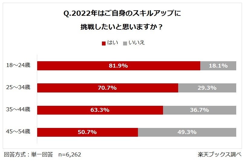 ●「2022年にスキルアップに挑戦したい」と回答した人は全年齢層で半数以上。18~24歳が81.9%と最も意欲的