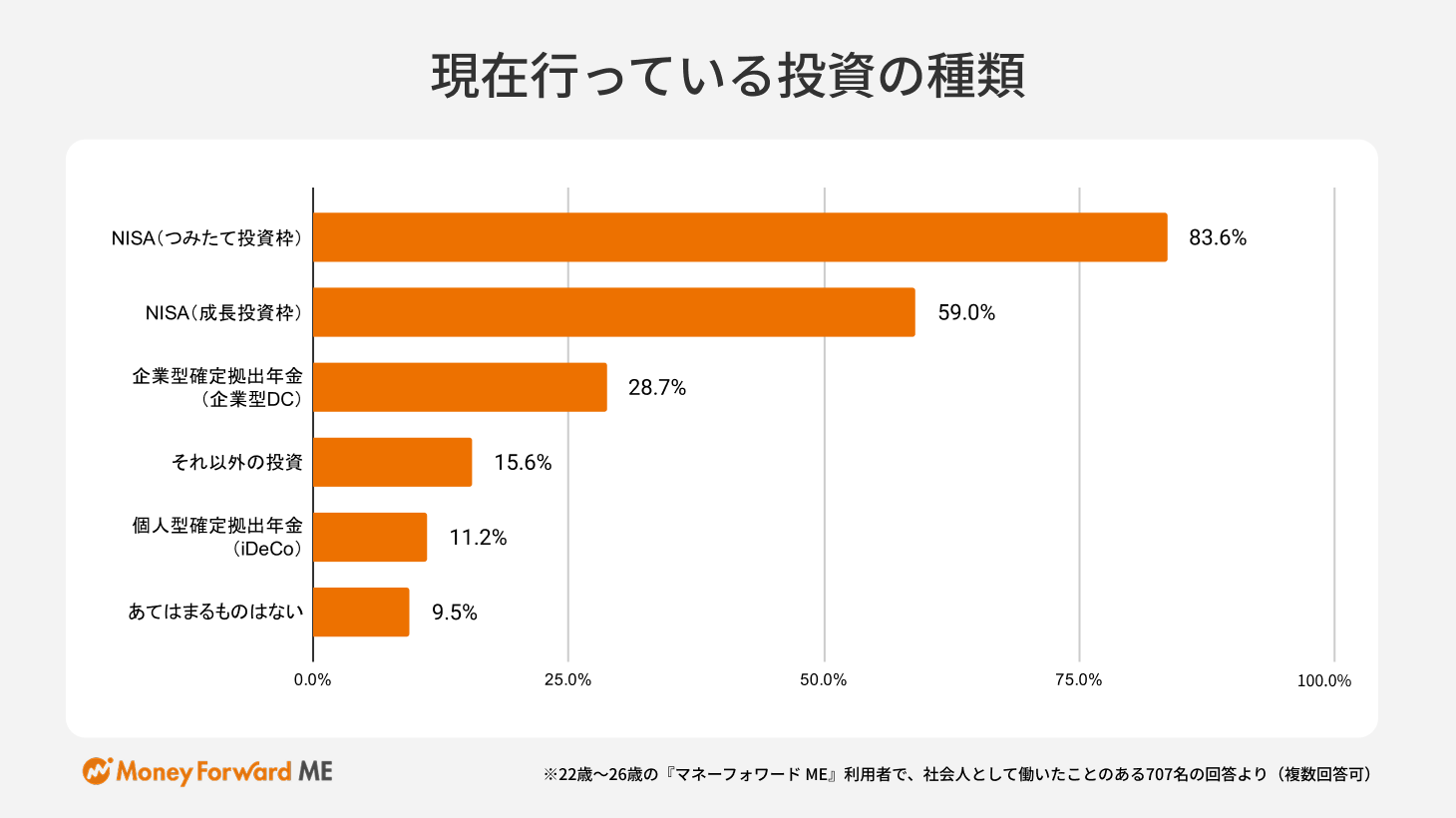 ※1:本プレスリリースでは、調査の実施時期に22歳~26歳の方(大学卒業の場合、社会人1~4年目にあたる)の回答をまとめています。なお、年齢に関わらず『マネーフォワード ME』ユーザーは、マネーリテラシーが高く、総務省家計調査と比較して平均所得が相対的に高い水準にあるほか、資産形成に占める投資の割合が高いなどの傾向があります。
