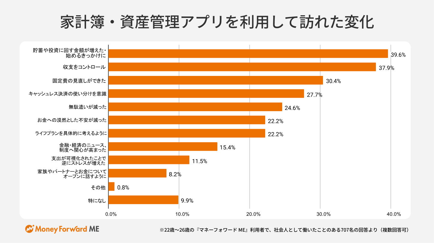 家計簿・資産管理アプリの利用を通して感じている変化として、1位「貯蓄や投資にまわす金額が増えた・始めるきっかけになった(39.6%)」、2位「収支をコントロールできるようになった(37.9%)」、3位「固定費(スマホ代やサブスクなど)の見直しができた(30.4%)」が上位になりました。