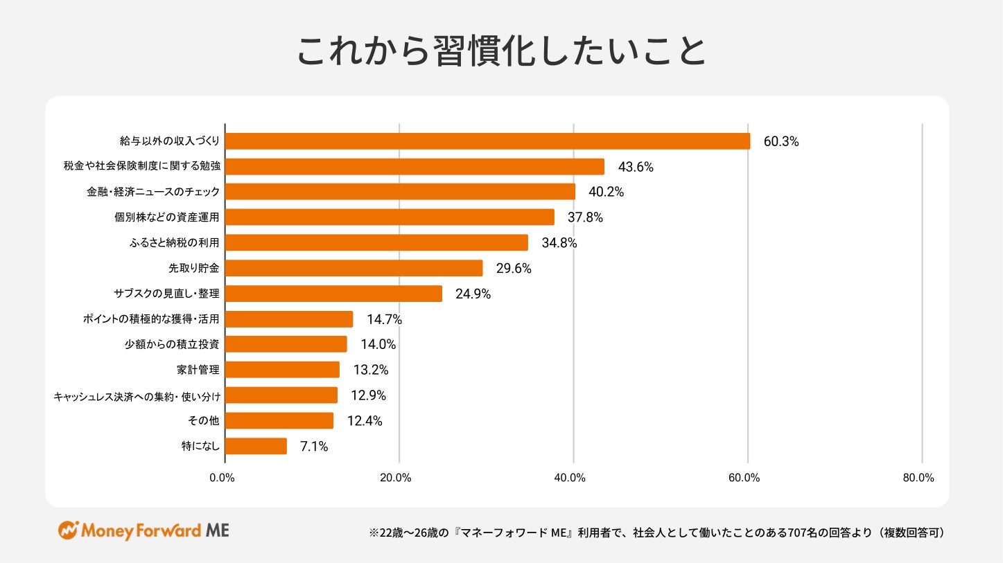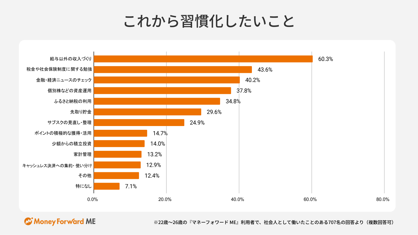一方、これから習慣化したいことは、1位に「給与以外の収入づくり(副業など)(60.3%)」が挙がりました。以降は、2位「税金や社会保険制度に関する勉強(43.6%)」、3位「金融・経済ニュースのチェック(40.2%)」と続きます。副業による複数の収入源の確保や、制度・経済ニュースの理解といった知識習得にも意欲的であることが分かります。将来の不確実性を前提に、能動的に資産を守り、育てるために必要な行動をしている様子が伺えます。